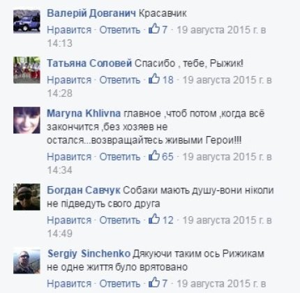 "Это наш Рыжик. Невероятно умный пёс. Он прожил 4 месяца на передовой в Широкино. Обладает даром предчувствовать миномётный обстрел. После того, как он первый раз был контужен, у него открылся этот дар. С тех пор, перед тем как должен прилететь снаряд, Рыжик своим звонким лаем сначала оповещал людей о приближающейся опасности, а потом прыгал в окоп или в блиндаж", говорится в сообщении.