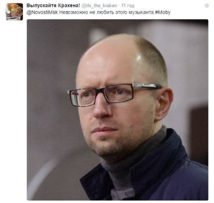 Другие пользователи соцсетей решили не останавливаться на одних городах и развить тему. Так, один из пользователей обнародовал фото экс-премьер-министра Украины Арсения Яценюка с подписью: "Невозможно не любить этого музыканта #Moby".