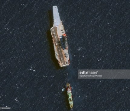В социальных сетях посмеялись над новым фото единственного российского авианосца «Адмирал Кузнецов», который не смог своим ходом добраться до берегов Сирии и был вынужден воспользоваться буксиром.