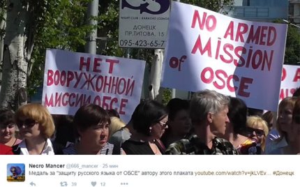 «Медаль за "защиту русского языка от ОБСЕ" автору этого плаката», - написал в Twitter пользователь Necro Mancer и опубликовал соответствующее фото.
