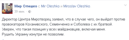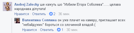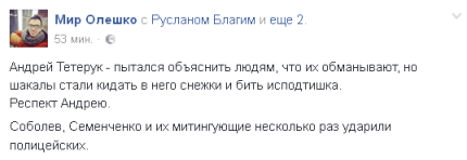 В свою очередь, журналист Игорь Чичкань, который находился в эпицентре событий, написал в своем Facebook: "Несколько человек, сопровождающих "блокиратора" Соболева, только что пытались разобрать "монумент Жизневского" на Груше. Типа, "на бруківку проти ментів". Полицейские этих не в меру "сердитых бунтарей" быстренько блокировали и не дали "побратимам" монумент разобрать".