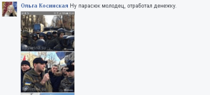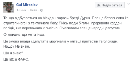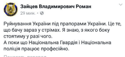 "Также "протестувальныки" периодически матерно обзывают Зозулю, руководящего действиями полиции, грозят тому, что он сядет. Типа, не пропускать нардепа с палаткой к АП - это злочын проты нации! Зозуля только что на Европейской площади "упаковал" Коханивського и несколько сопровождающих того пацанчиков; сейчас их медики осматривают, затем видимо повезут куда-то в околоток", - добавил он.