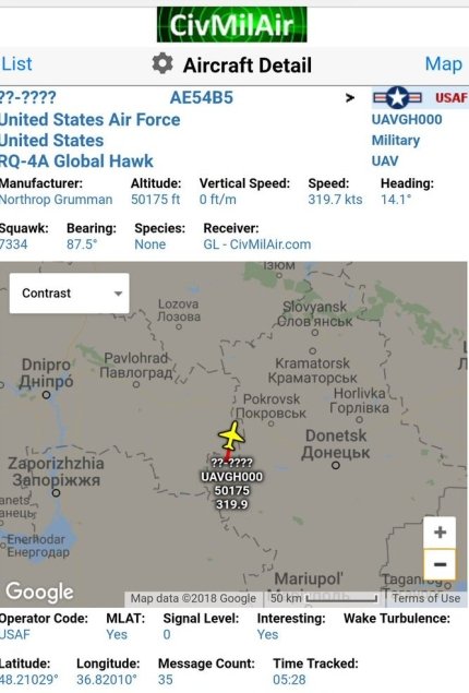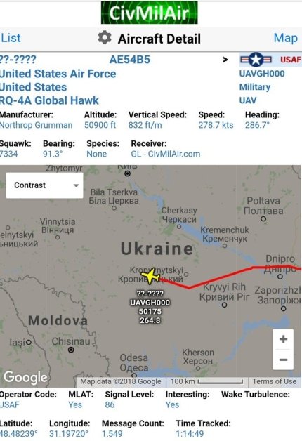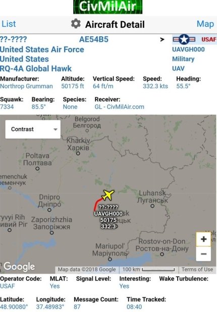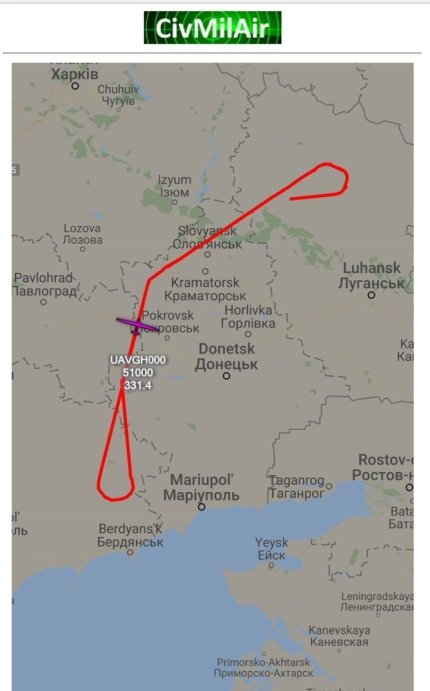 Карта разведполета американского беспилотника над Донбассом была опубликовна мониторинговым авиационным ресурсом CivMilAir в соцсети, передает ONLINE.UA.