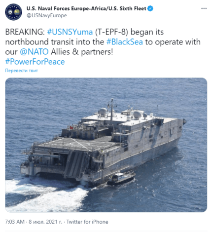 8 июля США направили в Черное море транспортно-десантный корабль ВМС USNS Yuma. Он примет участие в учениях Sea Breeze 2021 вместе с кораблями НАТО.