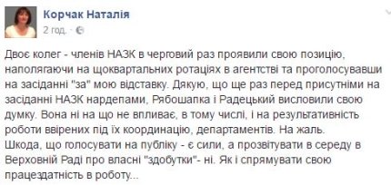 "Двое коллег - членов НАПК очередной раз проявили свою позицию, настаивая на ежеквартальных ротациях в агентстве и проголосовав на заседании "за" мою отставку. Спасибо, что еще раз перед присутствующими на заседании НАПК нардепами, Рябошапка и Радецкий высказали свое мнение. Оно ни на что не влияет, в том числе и на результативность работы вверенных под их координацию департаментов", - подчеркнула Корчак.