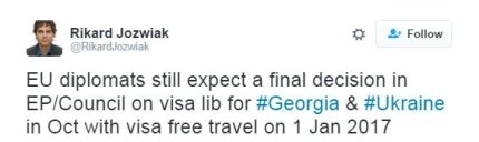 "Европейские дипломаты все еще ожидают окончательного решения в Европарламенте и Совете ЕС по визовой либерализации для Грузии и Украины в октябре с введением безвизового режима с 1 января 2017 года", - написал он.
