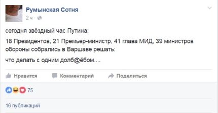 "Сегодня звездный час Путина: 18 президентов, 21 премьер-министр, 41 глава МИД, 39 министров обороны собрались в Варшаве решать, что делать с одним долбо*бом", - написал в Facebook пользователь под ником Румынская Сотня.