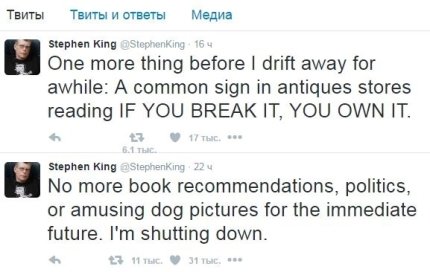 "Больше никаких книжных рекомендаций, политики и веселеньких картинок с собачками в ближайшем будущем. Отключаюсь", — написал он в прощальном твите.