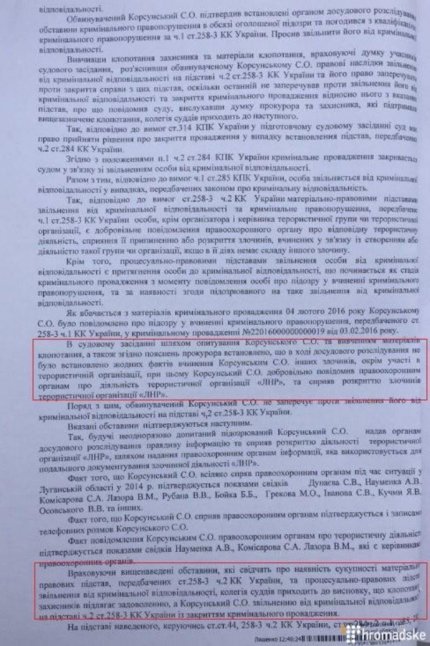 "... Согласно объяснений прокурора установлено, что в ходе досудебного расследования не было установлено никаких фактов совершения Корсунским других преступлений, кроме участия в террористической организации. При этом Корсунский добровольно сообщил правоохранительным органам о деятельности террористической организации ЛНР и способствовал раскрытию преступлений террористической организации ЛНР", - говорится в тексте решения суда.