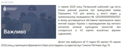 4 июня Печерский районный суд города Киева принял решение о принудительном приводе бывшего украинского лидера Петра Порошенко для допроса в качестве свидетеля в уголовном производстве, в котором исследуются обстоятельства перемещения через таможенную границу Украины с сокрытием от таможенного контроля коллекции культурных ценностей, которая состоит из 43 картин всемирно известных художников. Об этом сообщает ONLINE.UA со ссылкой на сайт Государственного бюрю расследований.