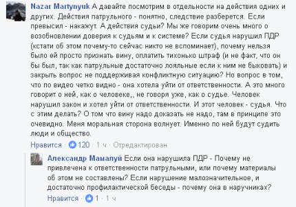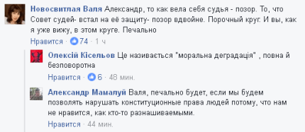 "Для всех, ненавидящих судей, слушайте, что скажу: нельзя людей закрывать в наручники без законных оснований!!! Нельзя. Неконституционно это. Произвол полицейский. Вам хочется спустить дело на тормозах потому, что пострадала от произвола судья. Этого не будет. Мы не позволим. В том числе и потому, что не хотим, чтобы завтра такое произошло с кем-то из вас", — резюмировал Мамалуй.