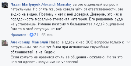 "По поводу позиции Маршала (Евгения Жукова). Я чисто по фактам. 1. То, что патрульным не понравилось, как с ними разговаривают – тон и манера общения, не дает им никакого права надевать на людей наручники", — подчеркнул Мамалуй.