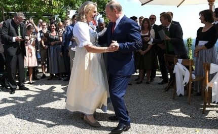 В субботу, 18 августа, российский президент Владимир Путин посетил свадьбу министра иностранных дел Австрии Карин Кнайсль. По прибытию он подарил невесте букет цветов, а после пригласил Кнайсль на танец.
