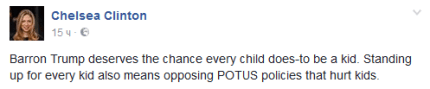 "Бэррон Трамп заслуживает шанс, который нужен каждому ребенку, — возможность быть ребенком", — написала 36-летняя Челси Клинтон.