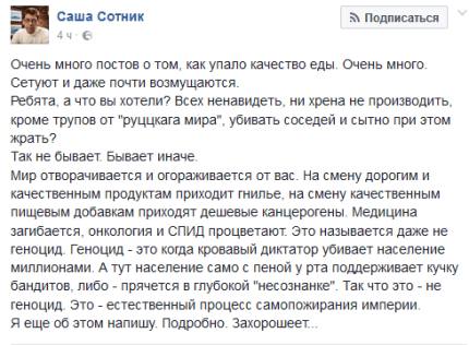 "Геноцид - это когда кровавый диктатор убивает население миллионами. А тут население само с пеной у рта поддерживает кучку бандитов, либо - прячется в глубокой "несознанке". Так что это - не геноцид. Это - естественный процесс самопожирания империи", - резюмировал он.