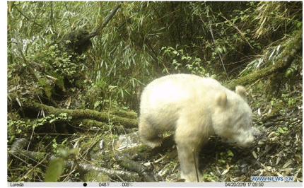 Автоматическая камера, установленная в лесу, сфотографировала бамбукового медведя в середине апреля. На его теле нет ни одного черного пятна, а глаза - розовые.