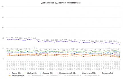 В этом соцопросе россиянам задавали открытый вопрос, доверяют ли они именно Путину. Результаты получились плачевными для главы Кремля, так как уровень доверия к нему находится на рекордно низком за всю историю наблюдений уровне — 28%. Впервые этот показатель упал ниже 30% в декабре 2019 года, в январе 2020 года ненадолго вырос, но с тех пор продолжил снижение.