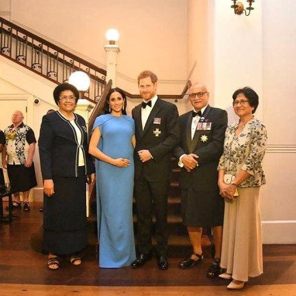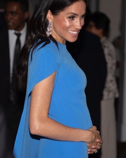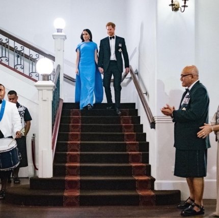 На ужин в отеле Grand Pacific, который был организован президентом Фиджи, генерал-майором Джиойе Конроте, Меган Маркл пришла в платье в пол, дополнив свой образ крупными серьгами и браслетом. Но не наряд супруги принца Гарри привлек общественность - папарацци обратили внимание на весьма округлившийся животик герцогини, которая находится на четвертом месяце беременности.