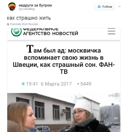 «Особенно это пошло с 2014 года, когда случился Майдан. Это полилось из всех щелей, даже из прессы. Я перестала смотреть шведские передачи, новости, перестала читать шведские газеты, потому что столько лжи полилось!» — цитируют женщину пропагандисты.