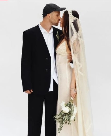 Для тайной церемонии артистка выбрала приталенное бежевое платье от бренда TGBotanical на тонких бретелях, а также вуаль ручной работы украинского бренда TheCoat с кружевом.