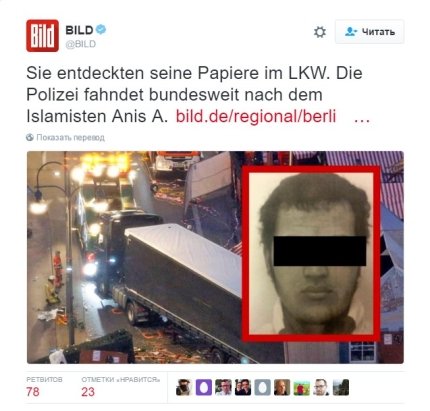 В сети появилось фото подозреваемого в теракте на рождественской ярмарке в Берлине, где террорист направил грузовик в толпу людей.