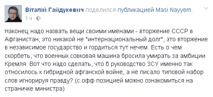 Так, известный украинский журналист Виталий Гайдукевич в своем Facebook отметил, что "наконец надо назвать вещи своими именами – вторжение СССР в Афганистан, это никакой не "интернациональный долг", это вторжение в независимое государство и гордиться тут нечем".