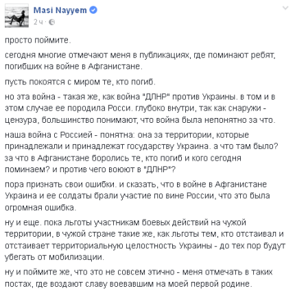 Кроме того, большой резонанс в сети вызвал пост украинца афганского происхождения Маси Найема, который является ветераном АТО.