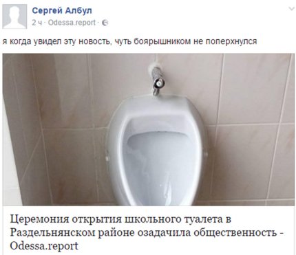 «Это не шутка. Это не сюр. Под звуки государственного гимна, с красными ленточками, с торжественными речами, с выступлениями детских коллективов в школе ОТКРЫЛИ ВОТ ЭТИ ТРИ ДЫРЫ В ПОЛУ, они же — школьный туалет. Туалетные скрепы Раздельнянского района. Как это комментировать, кроме как добиваться ареста Сигала (русскомировец-опоблоковец, глава района), не понимаю. После Революции достоинства, после всего, что страна пережила, в теплой, дружественной атмосфере, с танцами, песнями, хороводами, цветами и сладким столом открывают ту-а-лет. Так победим!» — пишет в соцсети гражданский активист Павел Паламарчук.