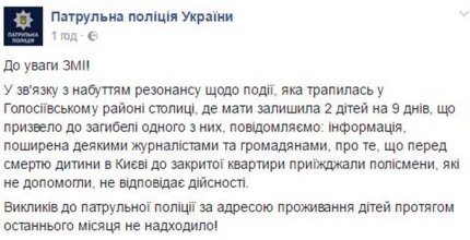 "Информация, распространенная некоторыми журналистами и гражданами, о том, что перед смертью ребенка в Киеве в закрытой квартире приезжали полицейские, которые не помогли, не соответствует действительности", - говорится в сообщении.
