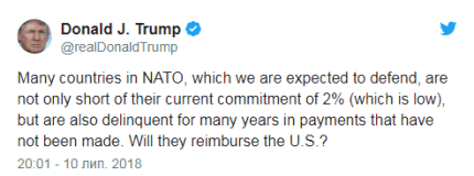 Об этом накануне саммита НАТО Трамп написал в Twitter, передает ONLINE.UA.