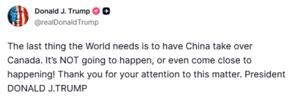 Если губернатор (премьер-министр Канады Марка, ред.) Карни думает, что он превратит Канаду в "порт разгрузки" для товаров и продукции, которые Китай отправляет в США, он глубоко ошибается.