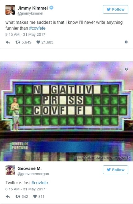 "Что огорчает меня больше всего, так это то, что я никогда не напишу что-то смешнее, чем "covfefe", - написал известный комик Джимми Киммел.