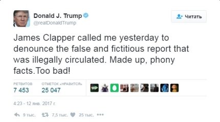 Трамп ссылается на слова главы Национальной разведки США Джеймса Клэппера, который якобы назвал приведенную в скандальном докладе информацию "ложной и придуманной".