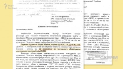 Однако, "Схемы" в своем расследовании нашли объяснения по этому поводу. В их распоряжении появился документ Украинского научно-исследовательского института гражданской защиты, в котором говорится, что "ДБН В2.2.16 не относится к временному обустройству внутреннего пространства здания МВЦ".