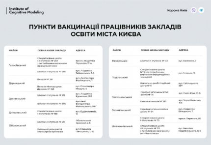 Кроме того, Минздрав напоминает, что в Киеве заработали 17 пунктов вакцинации педагогов. Пункты расположены во всех районах столицы (адреса указаны на изображении). Прививки работников образовательных учреждений будут проводить вакциной Pfizer.
