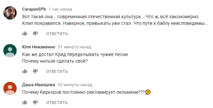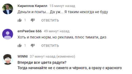 "А дальше нас ждут все цвета радуги?; Филипп - папа Тимати, теперь все понятно; Рекламы в этом ролике в 10 раз больше, чем смысла в тексте песни; что за чушь я посмотрел?; Деньги и понты... я таким никогда не буду; Киркоров продал душу Тимати; Это больше похоже на пародию; ох, зачем так себя позорить?; Не верю, что Киркоров там, а был народным артистом РФ", - пишут зрители в комментариях к видео.