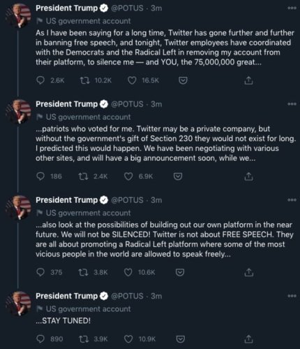 Трамп считает блокировку своего аккаунта в Twitter публичным "запретом свободы слова". Об этом говорилось в его твитте, который Трамп опубликовал в правительственном аккаунте президента США. Эту публикацию спустя несколько секунд удалили. В Twitter не исключает полную блокировку и этих учетных записей президента США в случае, если это "действительно будет необходимо для уменьшения вреда".