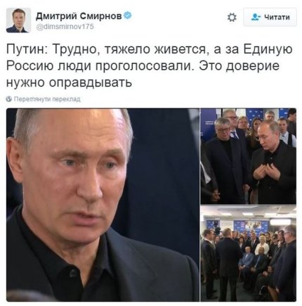 "Мы знаем, что людям живется непросто, проблем много и нерешенных вопросов много, и тем не менее результат вот такой, какой он есть. Ну, уже понятно, и экзитполы понятны, есть небольшие расхождения, но в целом Дмитрий Анатольевич сказал, можно с уверенностью уже заявить, что партия добилась очень хорошего результата, победила. Вот трудно, тяжело, а люди все равно за "Единую Россию" проголосовали", - заявил российский президент.