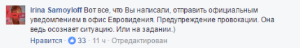 "Таким образом, поскольку мы не можем делать исключения для кого бы то ни было и поощрять, таким образом, нарушения порядка пересечения государственной границы Украины. Я считаю правильным идти по второму варианту. Пусть приезжает, но несет ответственность за нарушения законодательства Украины. Такое решение будет оптимальным с разных сторон, так как мы не запрещаем визит российской конкурсантки в Украину, но и публично покажем, на ее примере, что не собираемся оставлять безнаказанным факты нарушения государственной границы Украины. Думаю, что и наши западные партнеры отнесутся с пониманием к такому решению", - добавил нардеп.