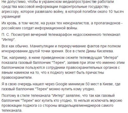 "Представьте себе, что у Вас в доме, не дай бог, произошел пожар. Вы подозреваете, что это не случайность, а поджог. Вы заявляете приехавшим журналистам, что Вы видели, что кто-то поджог Ваш дом и сбежал. При этом Ваш дом оборудован комплексной системой видеонаблюдения, которая осталась цела. Что Вы сделаете, чтоб помочь полиции как можно скорее установить злоумышленников ? Правильно! Вы немедленно предоставите видеозапись происшедшего, чтоб можно было попытаться установить личности поджигателей, номера машин на которых они приехали или маршруты их подхода к Вашему дому. Руководство телеканала "Интер" отказалось предоставить видео по "горячим следам" приехавшей на место событий следственно-оперативной группе. Его пришлось изымать уже ночью в рамках постановления следователя", - написал нардеп.