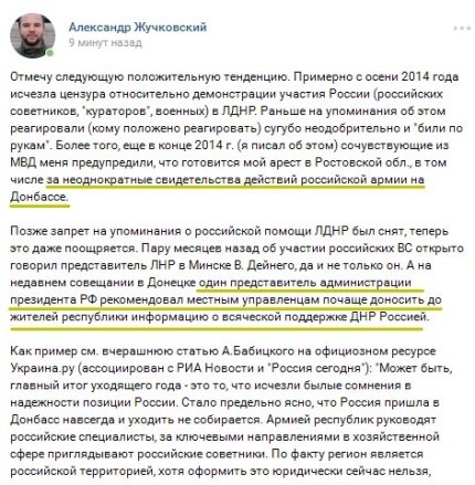 «Общественное мнение в РФ и Украине склоняют к тому, что российское присутствие на Донбассе объективно и уже необратимо. Никто не знает, сколько это продлится, но в какой-то момент регион станет российским де-юре, и для всех это будет уже естественным, неизбежным порядком вещей», - также написал Жучковский.