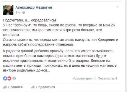 «Мы крестим почти в ти раза больше, чем отпеваем», - написал Авдюгин.