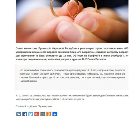 «Вот никто не хотел до войны, а тут шахтеры, трактористы местные стали все ополчением, и девки все наши резко захотели! Перспектива какая родить в ЛНР! Это как в Монако родиться, только лучше… Но и тут далеко ходить не надо - а что там с увеличением количества браков? Есть? Нет? Сомневаюсь», - пишет Вассерман.