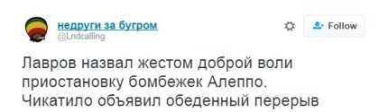 В свою очередь, глава МИД РФ Сергей Лавров назвал добрым жестом приостановку полётов ВКС России и ВВС Сирии в районе Алеппо.