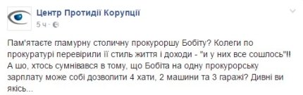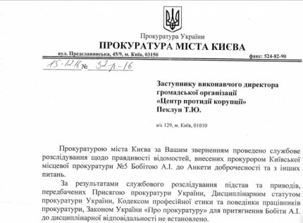 Также активисты обратили внимание на ее регулярные заграничные поездки. Поэтому они обратились к генеральному прокурору Луценко с требованием провести проверку прокурора. В ноябре прошлого года была начата проверка. Письмом от 15.12.2016 года заместитель прокурора Киева Репецкий уведомил, что по результатам проверки оснований для привлечения Бобиты к дисциплинарной ответственности не установлено.