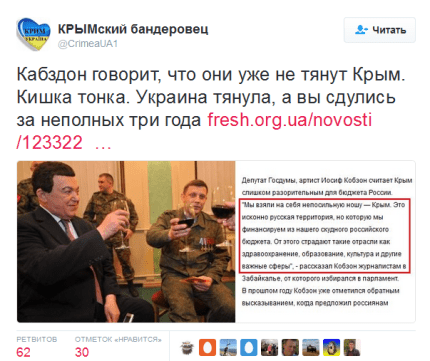 Одиозный депутат Госдумы РФ, певец Иосиф Кобзон стал мишенью едких насмешек и шуток социальных сетей после заявления о «непосильной ноше» в виде оккупированного Крыма, которую взвалила на себя Россия.