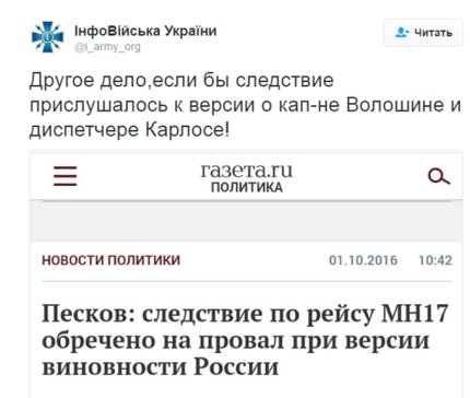 В Информационных войсках Украины - проекте возглавляемого кумом президента Украины Петра Порошенко Юрием Стецем Министерства информационной политики - посмеялись над очередным заявлением Кремля о результатах международного расследования крушения малайзийского лайнера Boeing 777 рейса МН17 над Донбассом в 2014 году.
