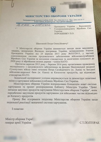 "В течении сентября 2015-марта 2016 года было организовано проведение эксперимента по продовольственному обеспечению на фондах Национальной академии Сухопутных войск и Западной военно-морской базы по Каталогу продуктов, что отвечает стандартом НАТО. Упомянутый эксперимент успешно внедряется и демонстрирует позитивные изменения в питании военнослужащих Вооруженных сил Украины, - говорится в обращении главы Минобороны Степана Полтораку к Петру Порошенко. - Прошу вас поддержать инициативу Министерства обороны Украины касательно дальнейшей реализации этой системы питания".