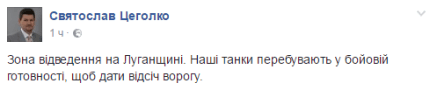 "Зона отведения на Луганщине. Наши танки находятся в боевой готовности, чтобы дать отпор врагу", - написал он.