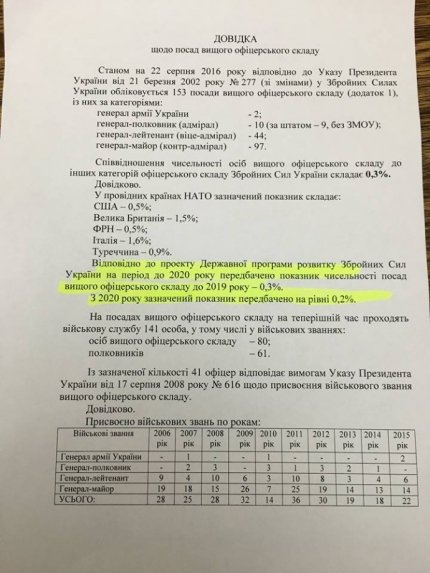 По его словам, в его руки попал документ, согласно которому в Вооруженных Силах Украины насчитывается в настоящее время всего 153 генеральские должности.